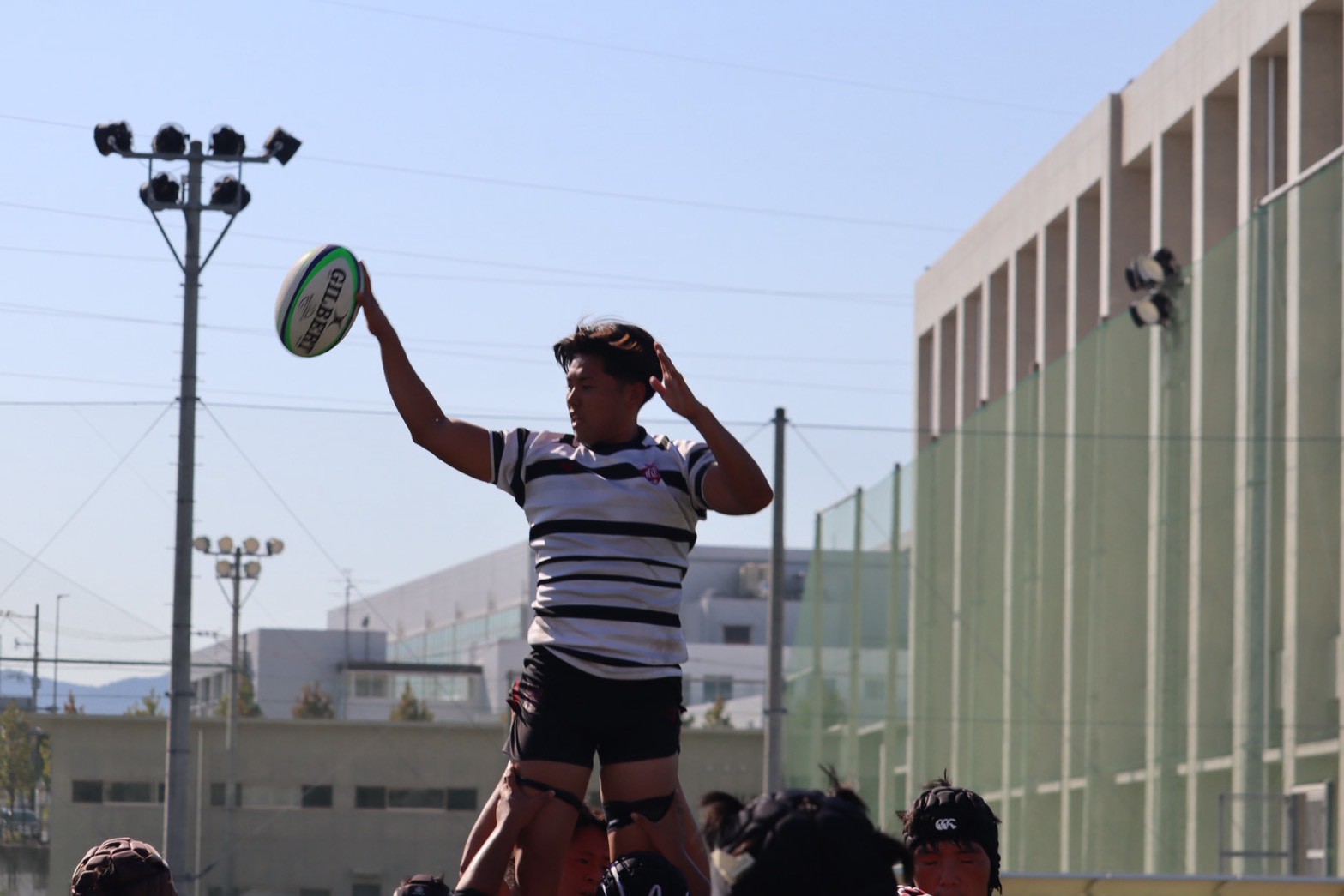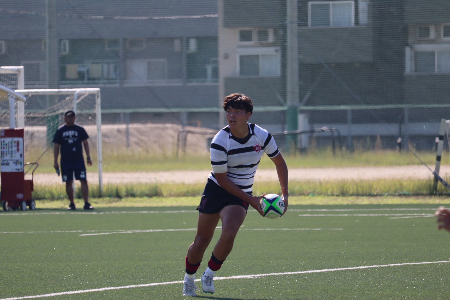 後半:敵陣10mから渡邉 陽平(1年生 東福岡 FL)が個人技の強いキャリーで抜け出し独走トライ!さらに追加点を広げます。さらにその後スクラムからバックスがラインブレイクし最後は木下 歩(4年生 福岡工業 SO)が再びトライ。その後トライを奪われ追い上げられますがリードを保ったままノーサイドとなり56-26で試合を終えました。