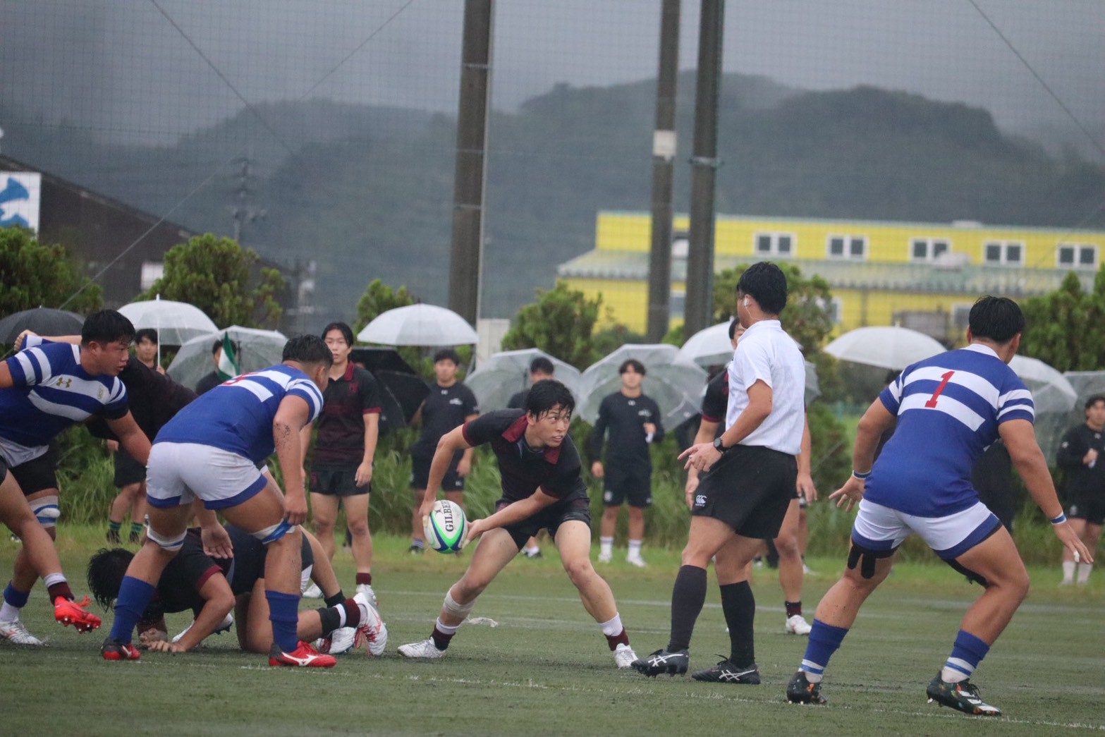 前半:相手のキックミスからライアウトのチャンスを得ると、サインプレーから石川 波潤(1年生 大分東明 LO)-牧野 虎羽(4年生 大津緑洋 HO)とボールを繋げましたが、トライに結びつけることができず、先制とはならず。しばらく両者一進一退の攻防が続きますが、前半10分相手がディフェンスラインの隙をついてトライ先制を許します。その後、ディフェンスの時間が長く続き厳しい時間が続きます。しかし、30分再びラインアウトでのチャンスが訪れます。サインプレーから楠本 快(2年生 徳島県立城東 FL)-牧野 虎羽(4年生 大津緑洋 HO)と繋がりトライ!5点を返し反撃の狼煙を期待するトライとなりました。