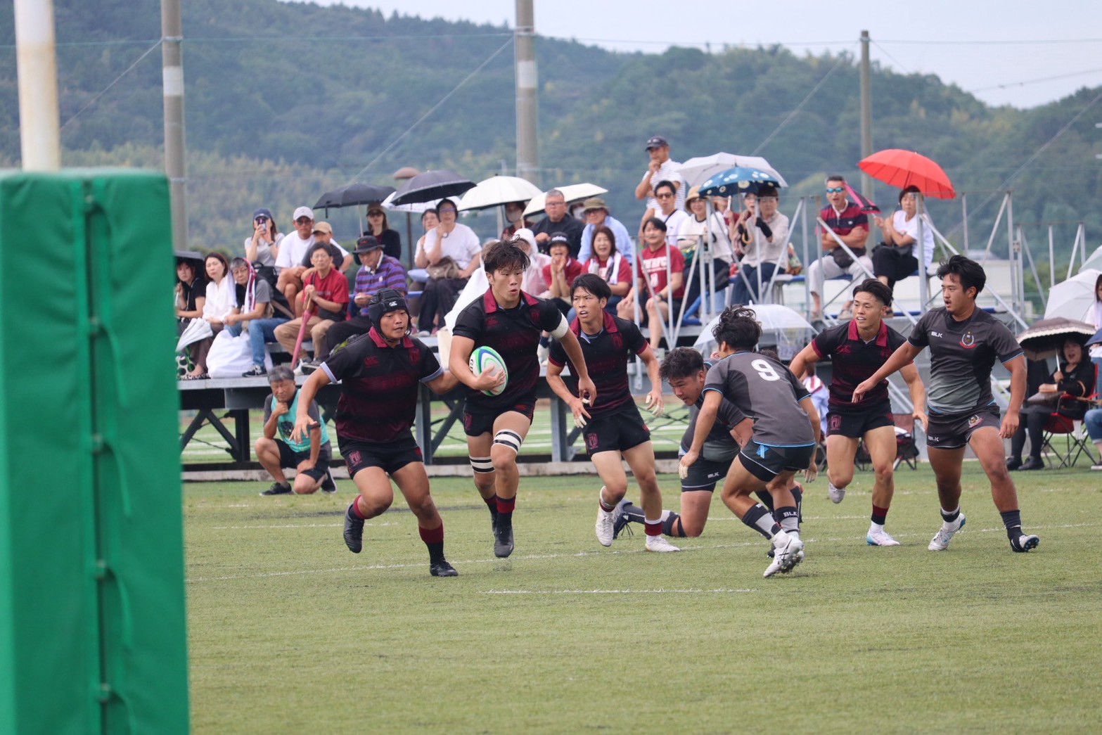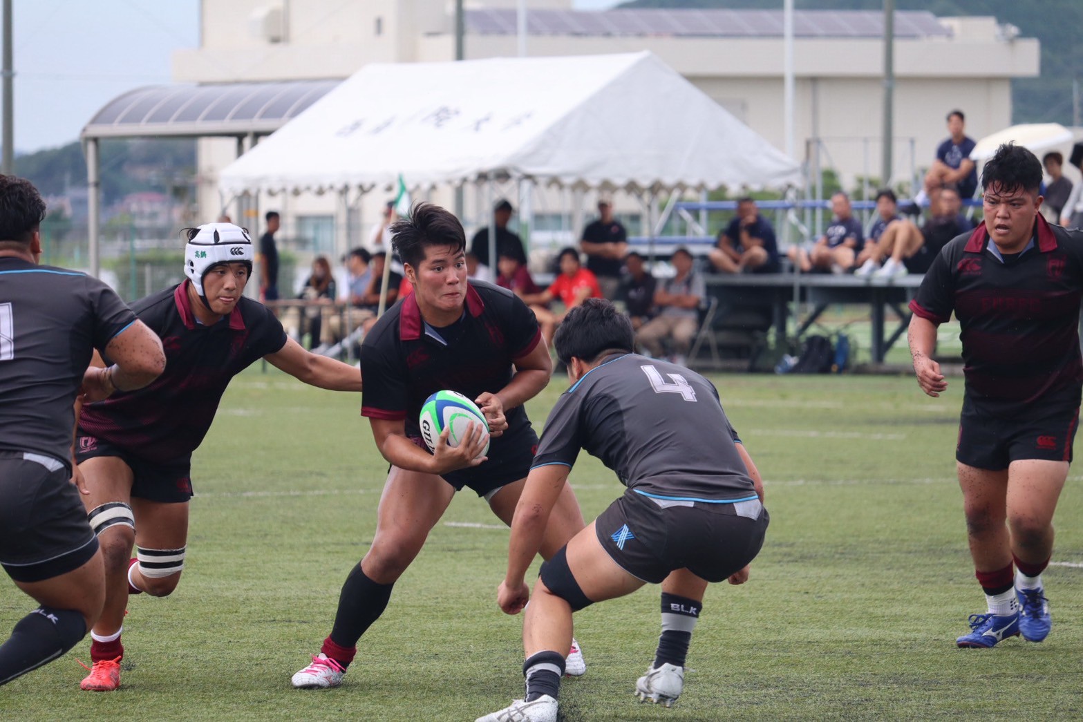 前半:キックオフからなかなか流れを持って来れず、ミスとペナルティーで自陣でのプレーを強いられる時間が続きました。12分自陣22m内での相手ボールスクラム。スクラムからFW勝負に持ち込まれ最後はトライ。キックも決まり0-7とします。しかし、直後のキックオフから相手のミスでマイボールスクラムとします。安田 光汰(3年生 東海大福岡 FB)が抜け出し、関 孝義(2年生 福工大城東 No.8)からのパスに辻 孝太朗(1年生 崇徳 LO)が反応しトライ!キックも決まり7-7同点とします。同点となった直後再びピンチとなります。再びFWにボールを持ち込まれトライ。7-14となります。そのさらにトライを奪われ7-21となりますが、30分モールから牧野 虎羽(4年生 大津緑洋 HO)が抜け出しトライ反撃の一本を奪い12-21とします。しかし、前半終了間際相手のラインアウトモールでトライを奪われ12-28で前半を終えます。
