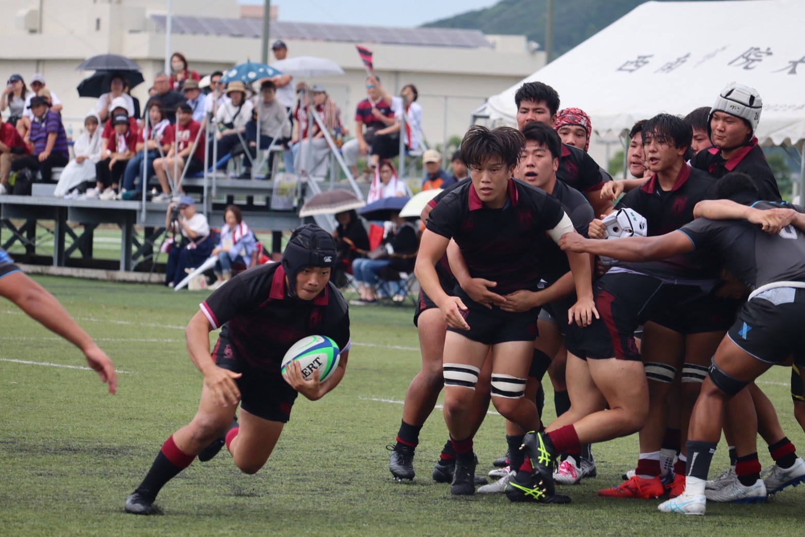 後半:開始直後、ハーフラインから馬場 稜典(3年生 東福岡 SO)がハイパントキックを蹴ります。そのボールに楠本 快(2年生 徳島県立城東 FL)が反応し、最後は越智 光太朗(4年生 東福岡 WTB)がトライ!キックも決まり19-28となります。その後はディフェンスの時間が続きますがFWのスクラムやチーム全員のディフェンスが光りなんとか0で凌いでいきます。そして、34分馬場 稜典(3年生 東福岡 SO)のキックを瀧田 雅公(3年生 石見智翠館 FL)-髙平 陸(4年生 東福岡 WTB)-前 大和(1年生 崇徳 CTB)と繋ぎラインブレイク!その後バックスが繋ぎ、再び越智 光太朗(4年生 東福岡 WTB)がトライ!難しい角度のキックも決まり29-28と逆転に成功します!その後、相手の猛攻を耐え続けますが、ラストワンプレーでペナルティーを許してしまい、29-31ノーサイドとなり、敗戦となりました。