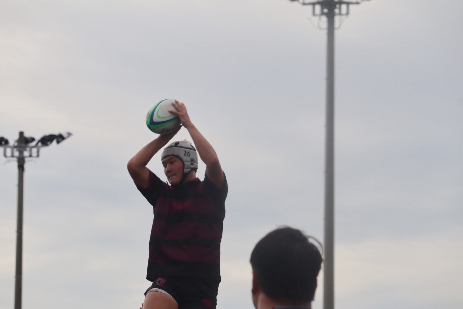 この試合同点トライを掴んだ辻 孝太朗(1年生 崇徳 LO) 1年生ながら身長を生かしたプレーとアグレッシブなプレーでこの試合でも活躍しました!