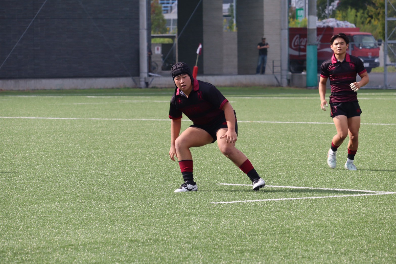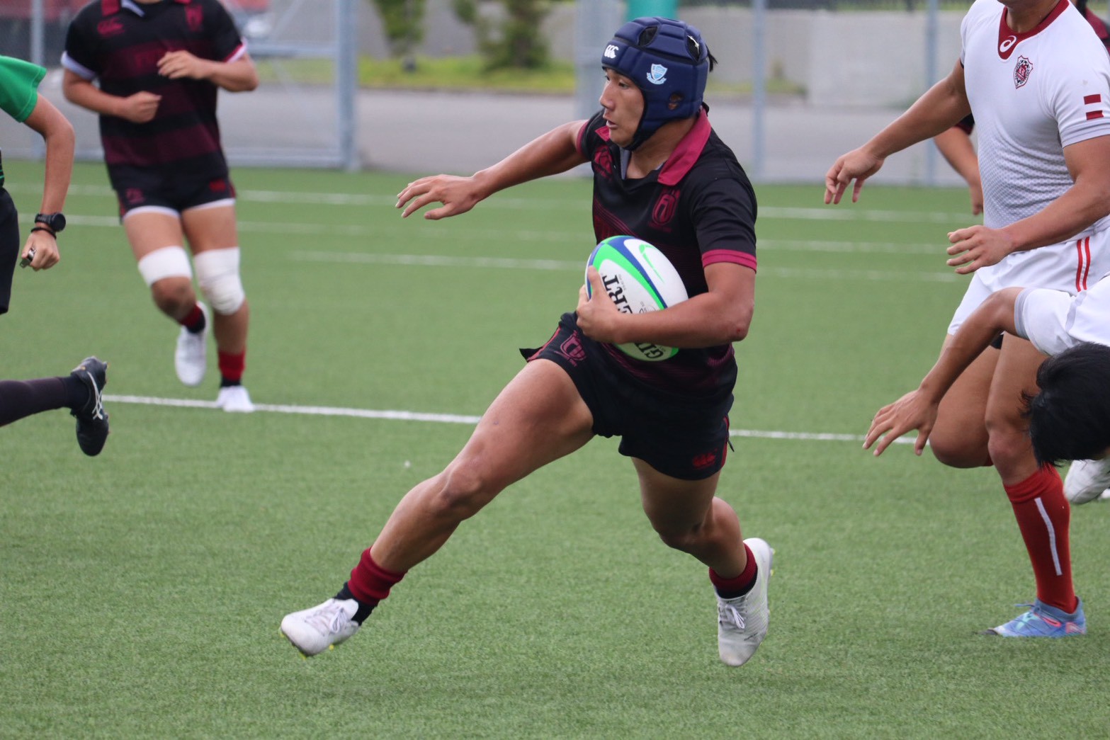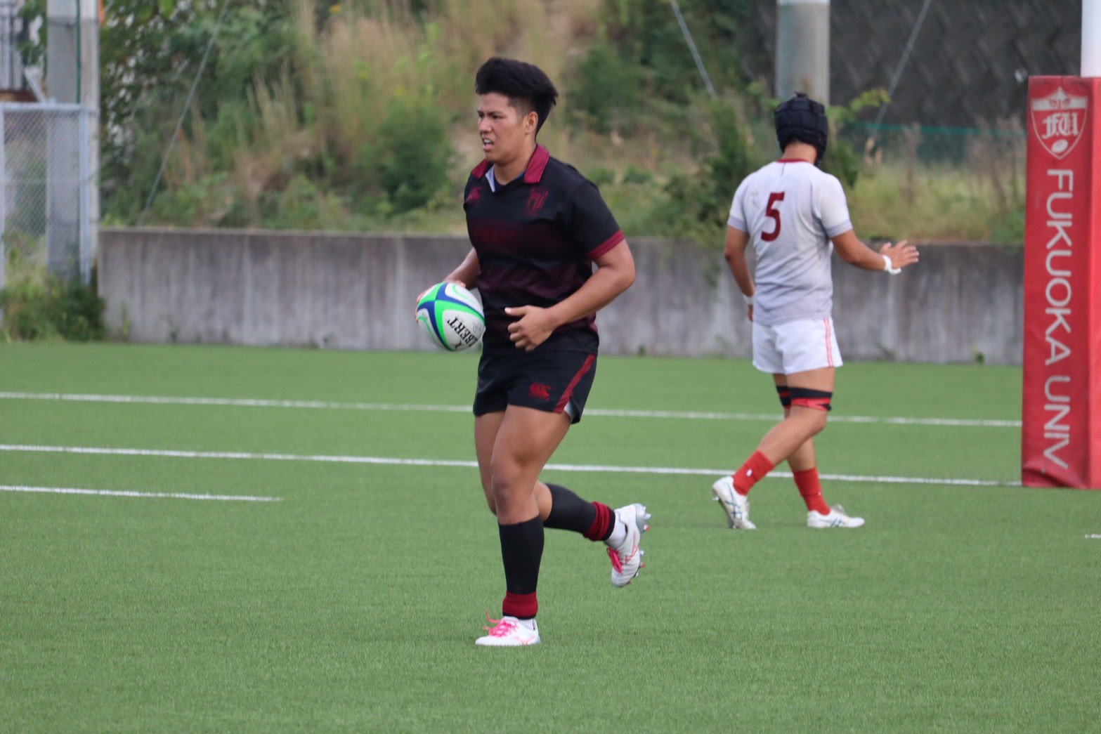 後半:トライが生まれない展開が続く中で相手の22m今シーズン強みとしているラインアウトモール形成をされ最後は2番が抜け出しトライ同点とされます。その後もピンチが続き再び22mでの相手ボールとFW勝負となり、一進一退の攻防が続きますが鹿児島大学のトライ逆転を許してしまいます。さらにピンチが続く中なんとかボール奪取に成功しキックで陣地を回復しますが相手にカウンターを許してしまい独走トライ。リードをさらに広げられる展開となります。しかし、追い込まれた中でチャンスが生まれます。22mラインアウトからモールで一本トライを返し反撃の狼煙とします。なんとか逆転をしたい展開でFWがフィジカルでラインブレイクし最後はBK安田 光汰(3年生 東海大福岡 FB)がトライでキックも決まり逆転!その後守り切りノーサイド結果45-43で試合を終えました。