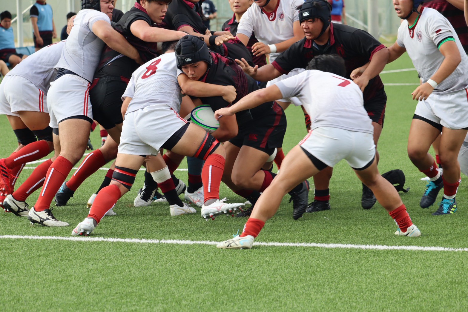 前半:互いにミスもありなかなか状況が変わらない中9分敵陣22mラインアウトから前原 泰生(3年生 福工大城東 CTB)が抜けだしサポートに回った島津 大靖(2年生 東筑 CTB)がトライ!先制に成功します。その後キックオフからのミスで相手ボールとされ相手の14番がキックからスピードを活かしトライ5点を返されます。その後、互いに取って取られての展開が続きますがなんとかリードを保ち前半を33-26で終えます。